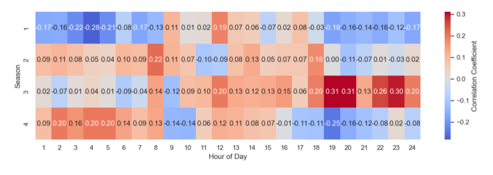 그림 18. 재생에너지 발전량과 SMP의 계절-시간별 부분 상관계수