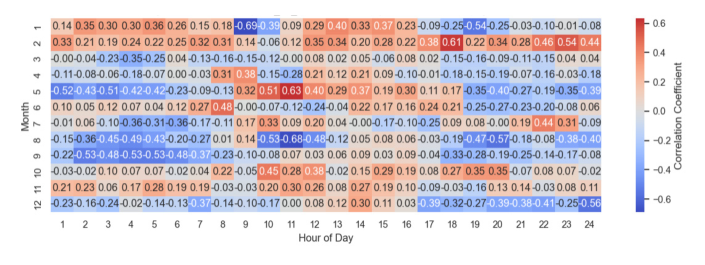 그림 17. 재생에너지 발전량과 SMP의 월-시간별 부분 상관계수