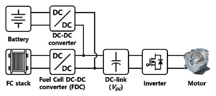 FCEV의 구동 시스템은 그림 1과 같이 연료전지 (Fuel Cell, FC) stack, 배터리, DC–DC 컨버터 및 모터 구동을 위한 인버터로 구성된다[3–4]. 그 중 FC와 연결되어있는 DC–DC 컨버터 (Fuel Cell DC–DC Converter, FDC)는 낮은 FC–stack 전압을 수백 V