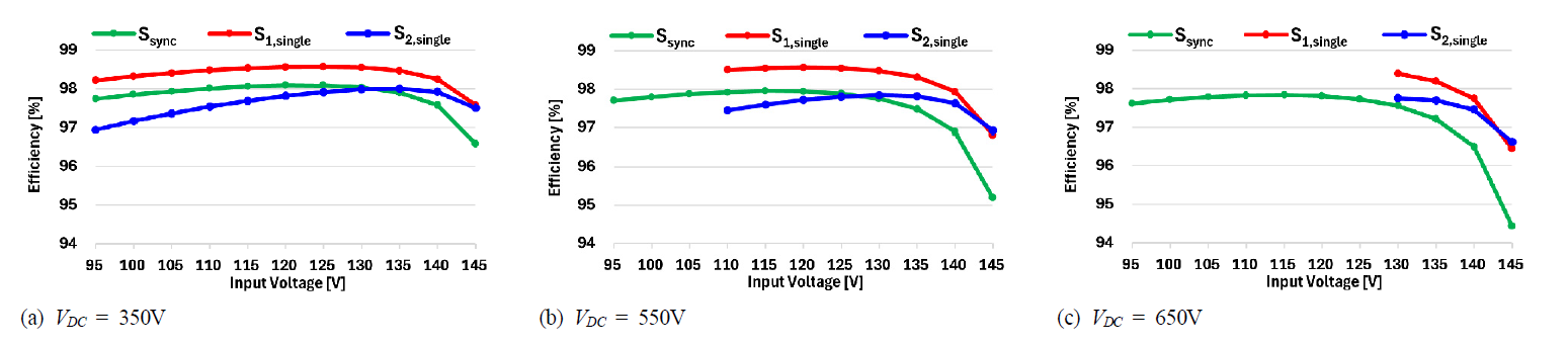 그러나 소프트 스위칭 구현을 위해 필요한 소자 수 및 동작 모드 추가가 요구되므로 설계의 복잡성이 증가하는 한계가 존재한다[27–28]. 제어 측면에서는 스위치의 듀티비와 위상차 가변 조합을 통해 최적의 1차측 커패시터 전압 (VC1)을 도출하여 효율을 개선하는 방안이 존재한다[29]. 그러나 해당 방안은 최적의 VC1과 스위치 위상차 도출을 위한 알고리즘이 필요하며, 고정된 입·출력 조건에서만 유효하기 때문에 주행 프로파일에 따라 입력 및 출력 전압 범위가 가변되는