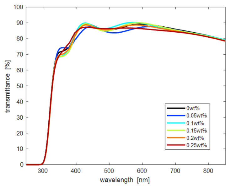 그림 1은 제작된 배향막의 투과도를 나타낸다. UV-Vis 분광기를 이용하여 SNW가 첨가되지 않은 PVDF부터 0.05wt%씩 SNW의 용량이 증가함에