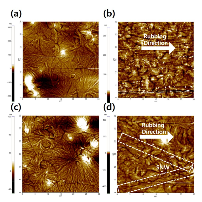 추정된다. 이러한 결과는 SNW가 배향막 내부에 존재하며 박막 외부로 돌출되지 않았음을 시사한다. 또한, SNW에 의한 지형보다 러빙에 의한 지형이