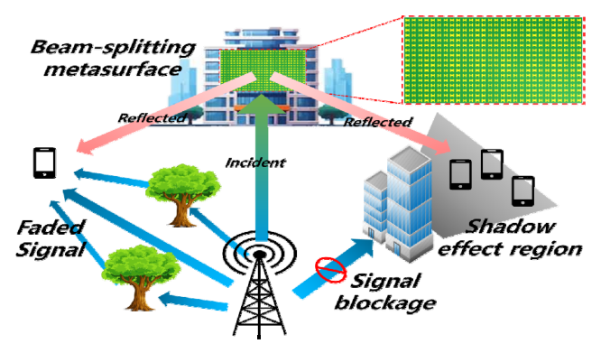 본 논문에서는 그림 1에 제시된 바와 같이 음영영역과 페이딩으로 인한 통신 품질 저하를 개선 하는데 활용될 수 있는 반사형 메타표면을 설계하였다. 기존의 전파분할 표면