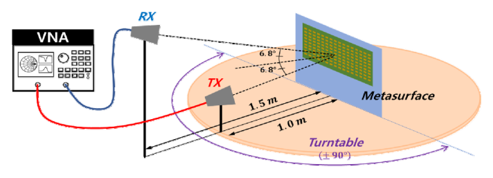 통해 제작된 메타표면에 입사각 0°를 유지하며 회전한다. Rx 안테나는 고정된 상태로, 메타표면에서 반사되는 전파를 각도에 따라 수신한다. 측정구간(Theta,