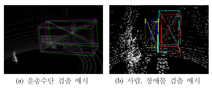 cuboid다. 빨간색과 파란색 cuboid는각각 장애물과 사람 class에 대한 label을 의미한다. 예시의 (b)는 모델이 객체를 검출하지 못했을