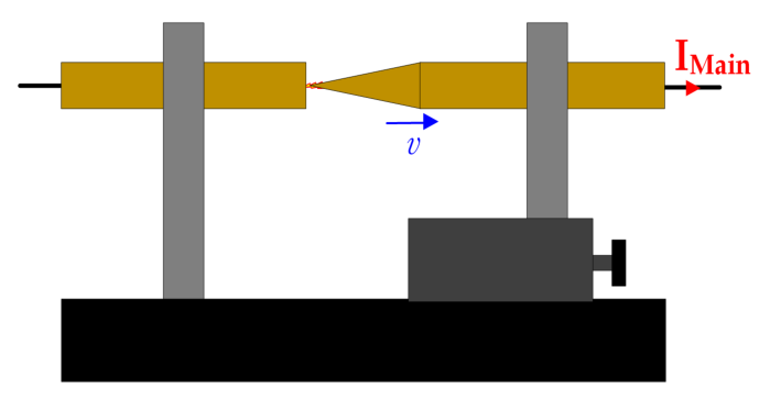 가능한 다양한 상황을 모의하였다. 사용된 아크 발생기는 원뿔형 전극과 원기둥형 전극을 접촉시킨 후, 일정한 속도 $v$ [mm/s]로 분리시키는 구조이며,