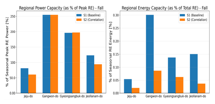 비해 상관관계 가중치를 도입한 시나리오(S2)는 BESS 에너지 용량이 유의미하게 감소하는 경향을 보였다. 또한 재생에너지 규모 차이를 보정 하여