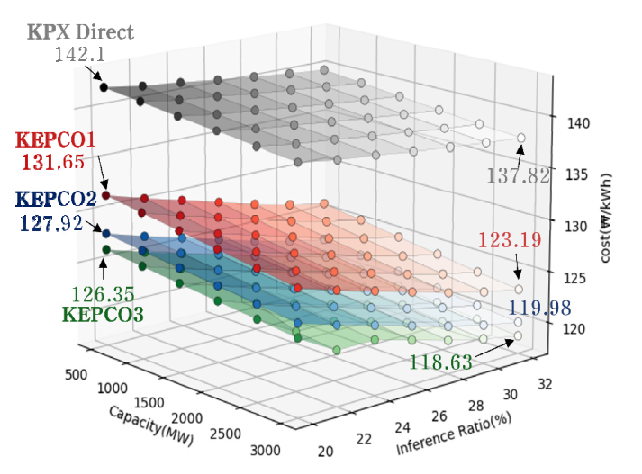 조합한 경우가 가장 낮은 평균 조달 비용을 보였다. 또한 추론 비중 및 PPA 계약 용량이 증가할수록 평균 조달 비용이 감소하는 경향을 보였다. 분석