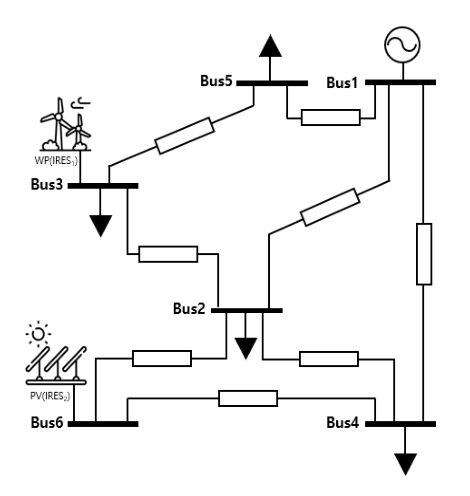 그림 1은 기존 Garver 계통의 기본 데이터를 기반으로 WP 및 PV를 연계한 수정 Garver 계통을 구성하여 나타낸다. 그림 1과 같이, 6개의 모선에 1개의 AC 발전원과 2개의 IRES가 연계되어 있고, IRES1은 모선 3의 WP, IRES2는 모선 6의 PV이다[18].