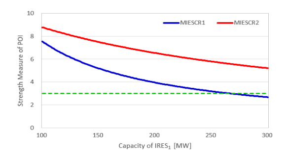 그림 2. IRES1 용량에 따른 수정 Garver 계통의 MIESCR
