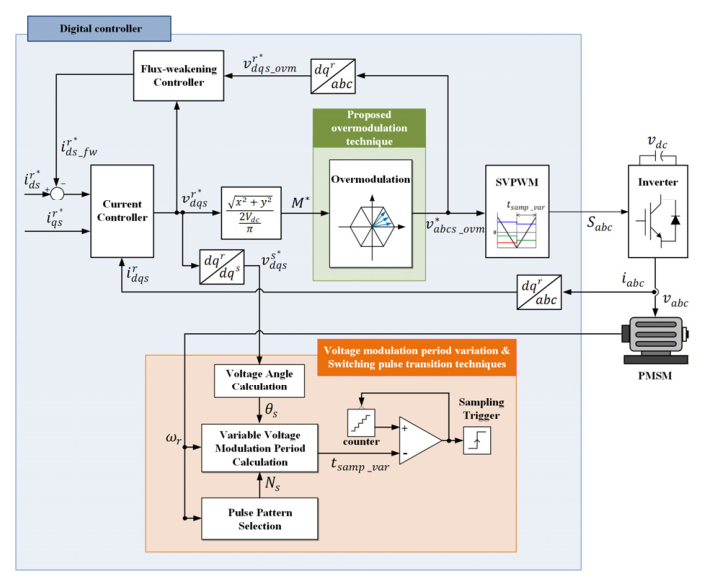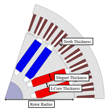 This paper proposes a ferrite permanent magnet?based double-layer spoke-type permanent magnet synchronous motor for ultra-compact electric vehicle traction applications, aiming to achieve high torque density while reducing cost and dependence on rare-earth materials. By adopting a double-layer spoke rotor structure, the q-axis inductance is increased, enabling effective utilization of reluctance torque to enhance overall performance. Although the double-layer spoke-type rotor structure is effective in enhancing reluctance torque utilization, it tends to exacerbate cogging torque, torque ripple, and harmonic distortion. Therefore, a core skew technique is employed to alleviate these undesirable effects. Key design parameters such as magnet thickness, rotor radius, I-core thickness, and tooth thickness are systematically optimized based on the required torque?speed operating region derived from vehicle driving conditions, and an integrated performance index incorporating cogging torque, torque ripple ratio, and line voltage total harmonic distortion (THD) under load is employed to determine the optimal design. The proposed motor is evaluated through two-dimensional and three-dimensional finite element analysis and validated experimentally using a prototype and dynamometer testing. Experimental results demonstrate that the proposed design achieves a cogging torque reduction of approximately 95 %, a torque ripple reduction of 37 %p, and a decrease of about 14 %p in line voltage THD under load compared to a conventional Nd-based motor, while the measured average torque and torque ripple agree with the analysis results within 1 % error, confirming the validity and reliability of the proposed design methodology.