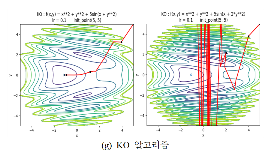 Nesterov 알고리즘, (g) KO 알고리즘은 수렴하지 못하고 진동하는 것을 볼 수 있다. 그림 2에서 도트(●)는 시작점 (5, 5)에서 5번의 학습 iteration마다 한 번씩 사용하였다.