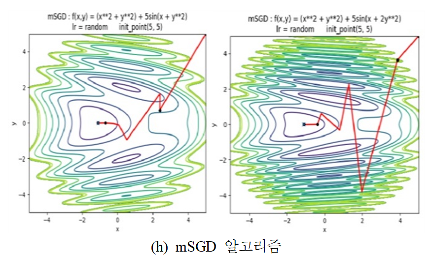 사용하였다. 따라서 그림 2의 우측 그림들은 대부분의 최적화 알고리즘의 수렴 성능이 좌측 그림에 비해서 떨어지는 것을 볼 수 있는데, (b) Momentum 알고리즘, (c)