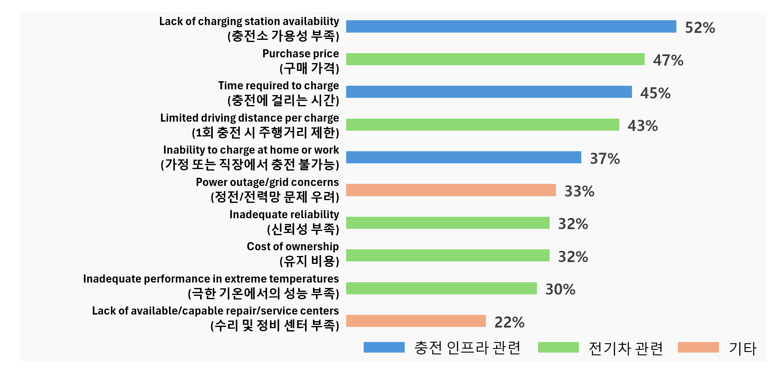 부족(52%), 충전에 걸리는 시간(45%), 가정 또는 직장에서 충전 불가능(37%)으로 10개 요인 중 3개를 차지하였다. 특히, 충전소 가용성