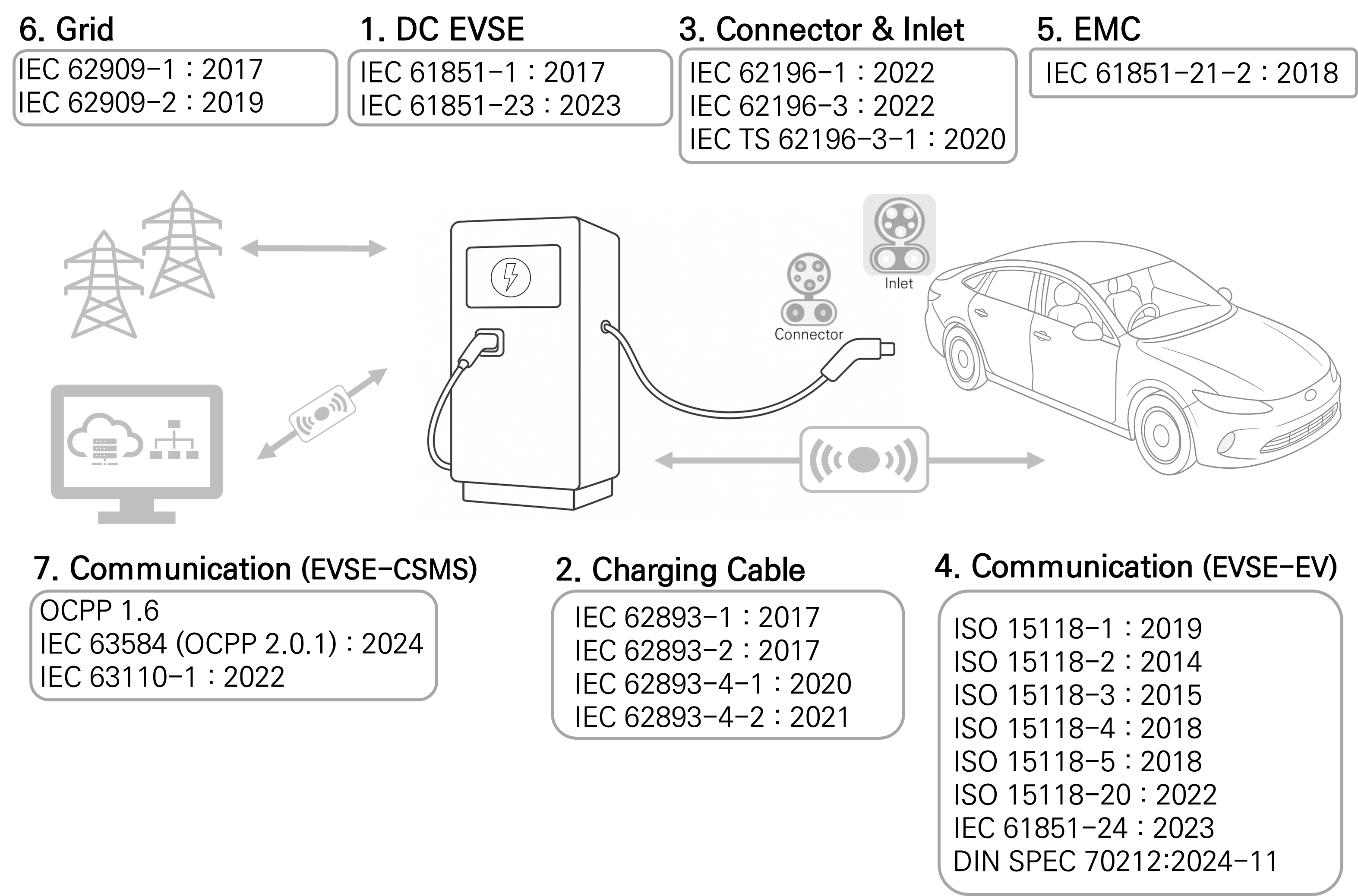 (EVSE-EV), EMC, Grid, Communication(EVSE-CSMS) 7가지로 구분하고 관련된 국제 표준을 정리하였으며 구성은 그림 6에 표현하였다.