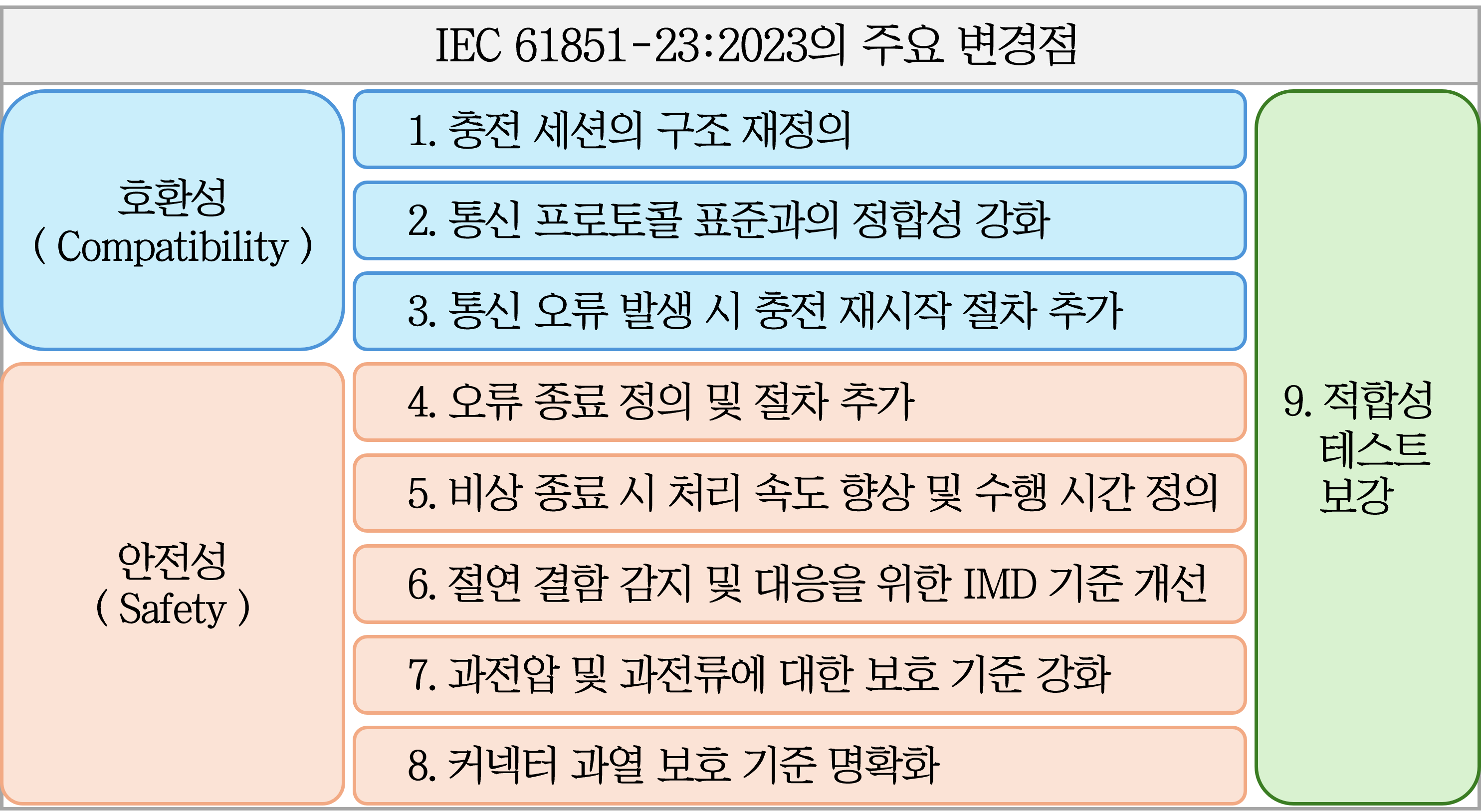 따라서, 향후 국내 급속 충전 인프라와 표준에 IEC 61851-23:2023의 개정 사항을 반영하면 호환성과 안전성 측면의 개선이 기대되며, 국내