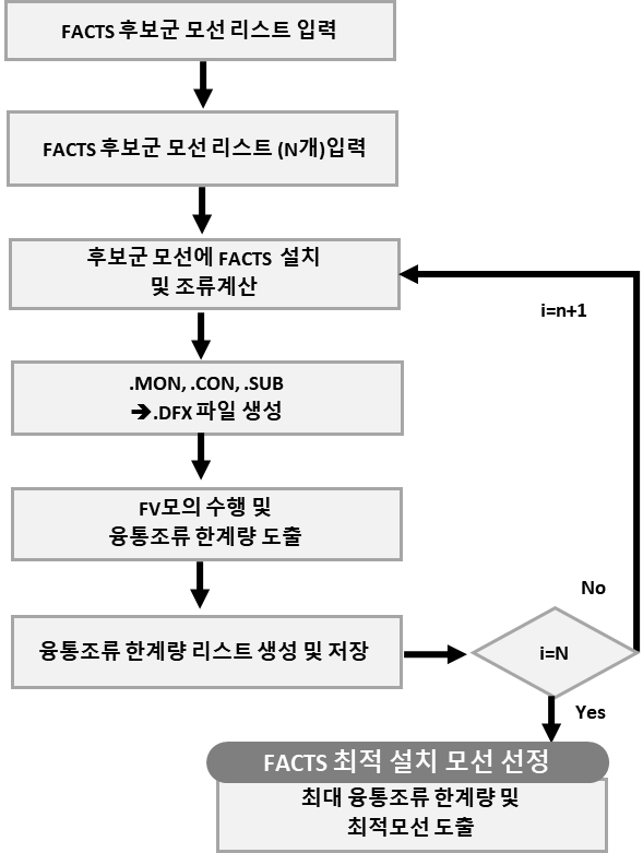 최적위치 선정을 위한 시뮬레이션 순서도를 그림 4에 나타내었다. FACTS 위치 후보군은 주요 융통선로가 위치한 모선들로 구성되며, 위치별로 융통조류 한계량을 산출한다. 이후 융통조류 한계량이 가장
