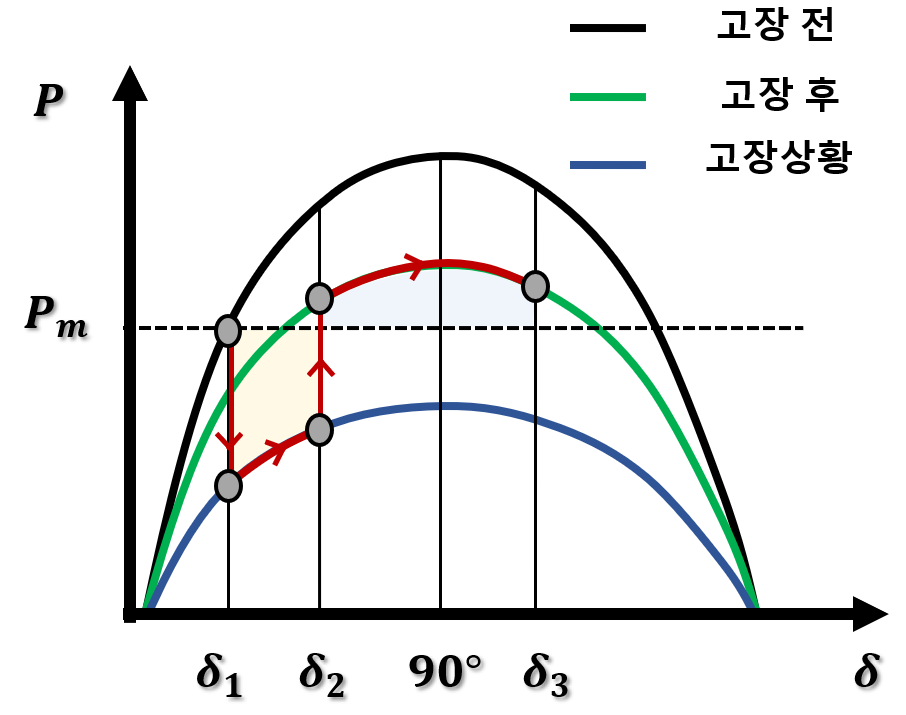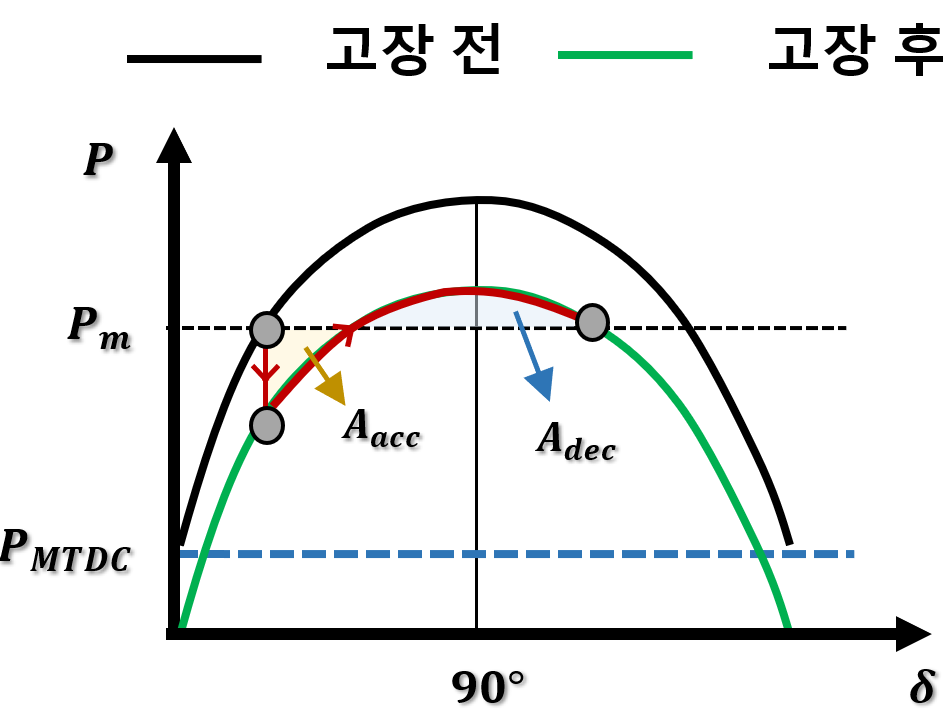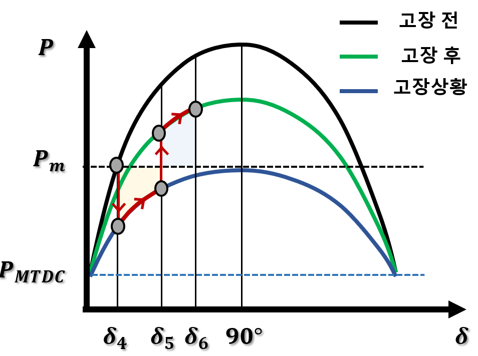 위 수식은 기존의 AC망 1기 무한모선 다이어그램의 P-δ수식에서 MTDC의 유효전력 출력이 더해진 것으로, Ppre는 고장 전 발전기 전력위상각