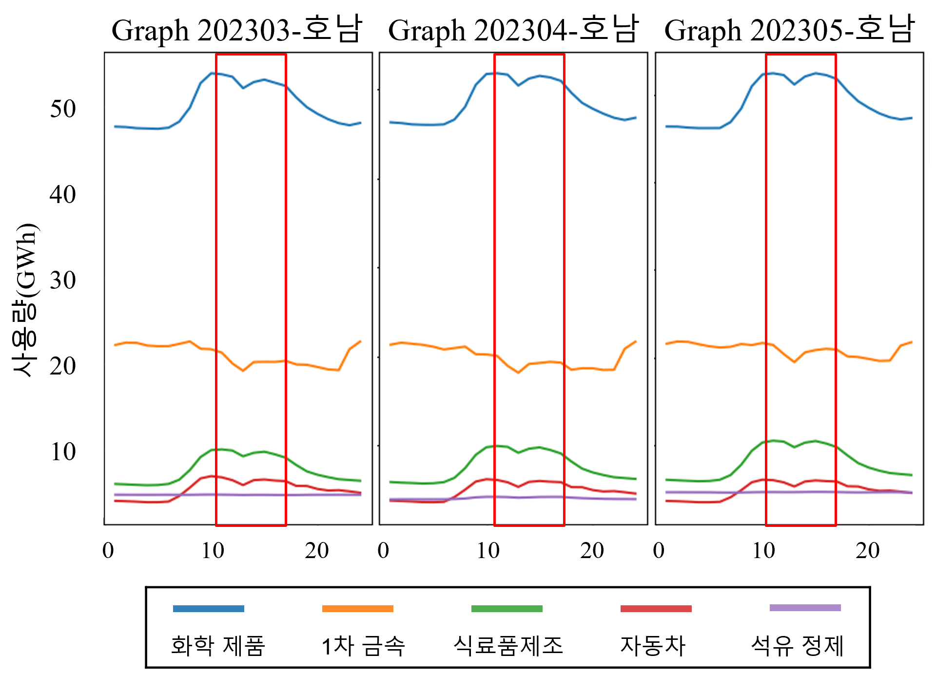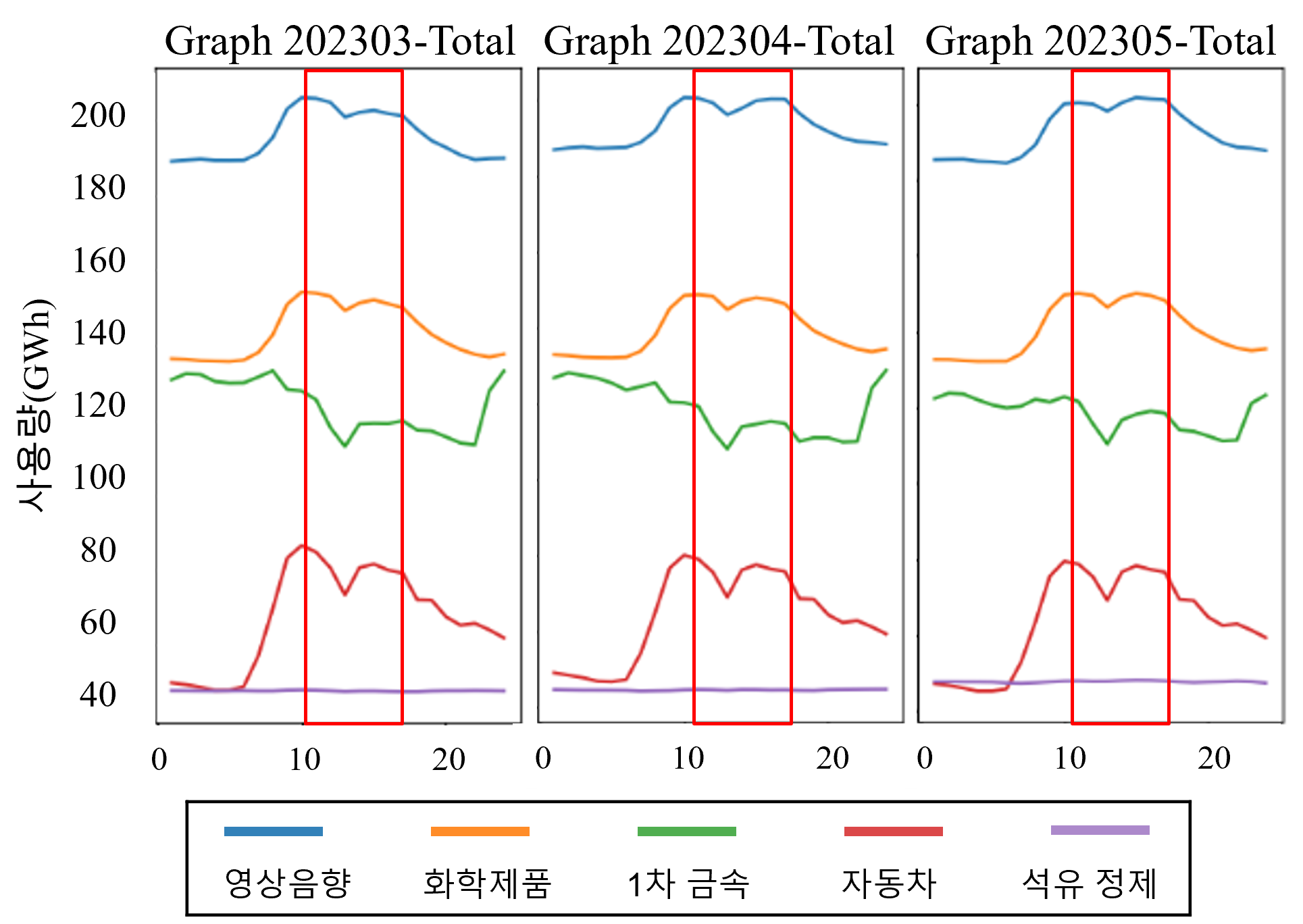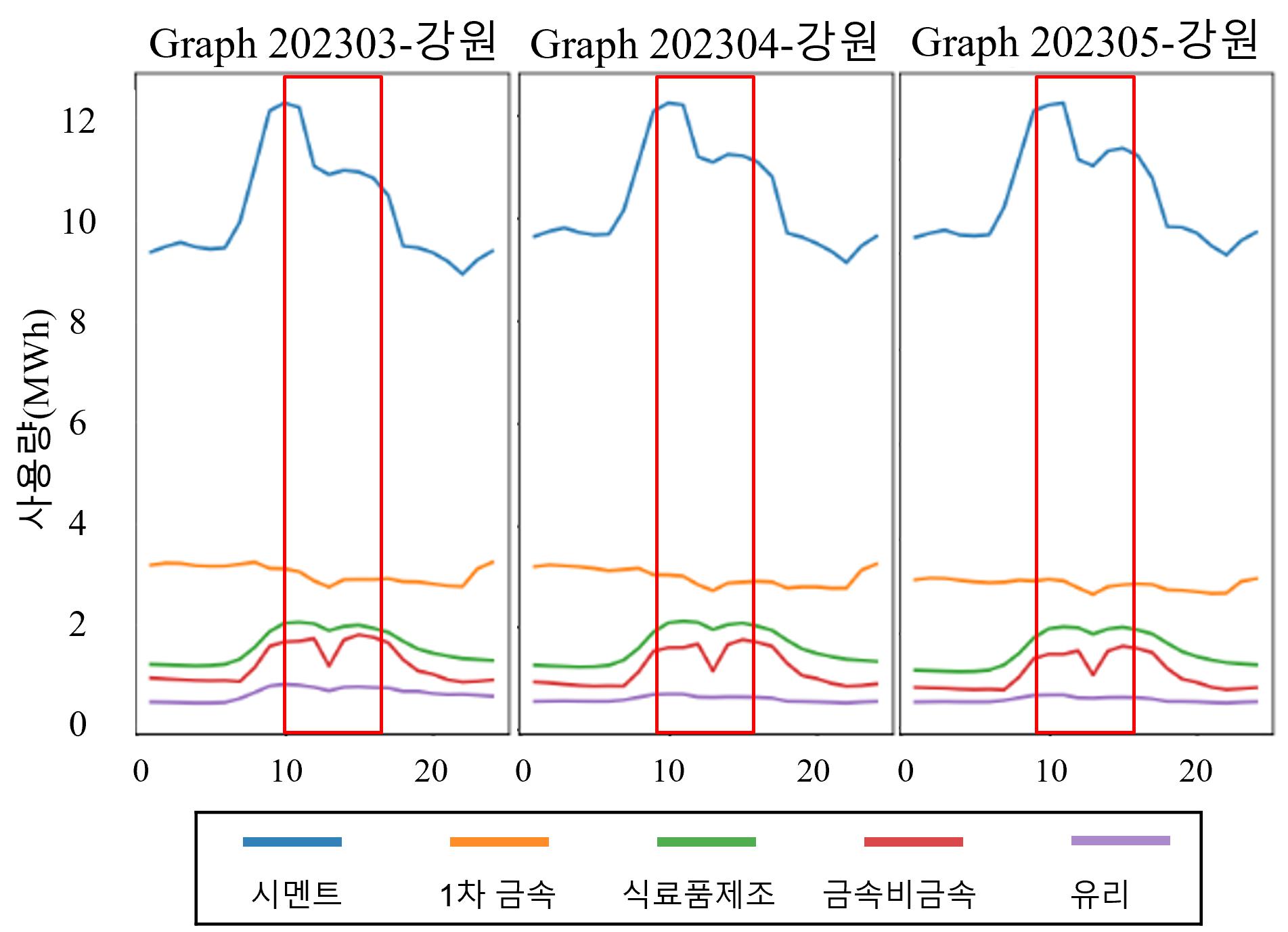 효과를 분석하였다. 2024년 봄철의 산업분류별 전력사용량 분석 결과는 그림 3~그림 5와 같다.