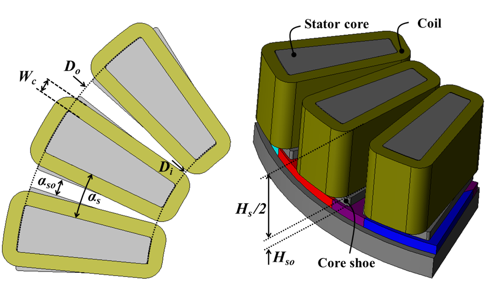 통해 코깅 토크를 이론적으로 크게 저감할 수 있는 최적 스큐 각도가 슬롯 피치와 극-슬롯 조합에 대한 비교적 명확한 수식으로 정립되어 있다[6]. 하지만, AFM은 내경 방향과 외경 방향으로의 누설 자속 차이와 토크에 기여하는 모멘트 암 길이 차이로 인해 정확한 수학적 표현이 난해하다[4].
