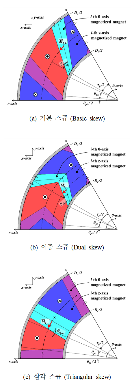비교를 위해 동일한 스큐 각도 $\theta_{skew}$를 기준으로 설계되었다. 기본 스큐는 자석의 내경과 외경을 잇는 선이 내경과의 접점을 기준으로