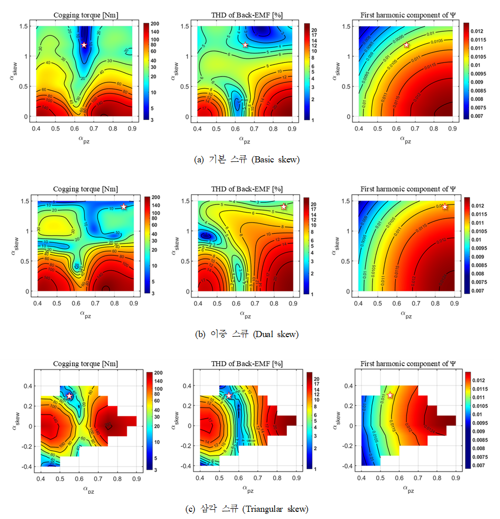 이는 해당 영역 내에서 두 주요 분석 인자에 대해 민감도가 낮은 것을 의미한다. 동일한 영역에서 역기전력의 THD는 $\alpha_{skew}$가
