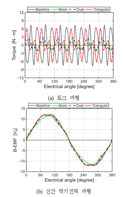 그림 4에서 나타나는 스큐 구조별 성능 특성의 차이는 각 구조의 기하학적 형태가 공극 기자력의 공간 고조파를 상쇄하는 방식이 다르기 때문으로 분석할 수 있다.