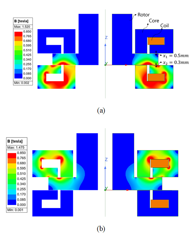 자속밀도 분포를 나타내며, 그림 2(b)는 양(+)의 방향으로 전자기력이 작용하도록 코일에 최대 전류를 인가한 상태에서의 자속밀도를 보여준다. 최대 제어 전류 인가 시 강자성체(S45C)의