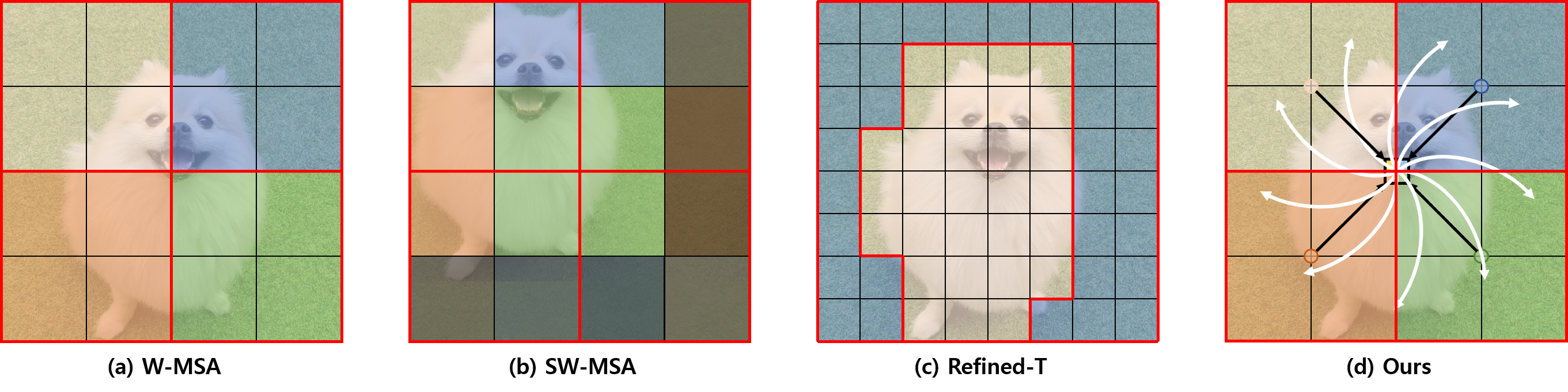 그림 1. swin transformer 기반 윈도우 어텐션 기법 비교