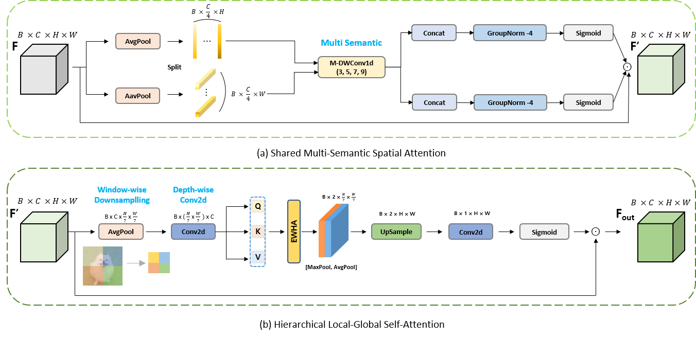 Spatial 어텐션을 수행한다. 이때, HLSA는 Spatial and Channel Synergistic Attention(SCSA)[11]에서 제안한 시너지 기반 설계 원리에 영감을 받아, Channel 어텐션과 Spatial 어텐션의 협력적 구조를 윈도우 기반 구조로 확장한 모듈이다.