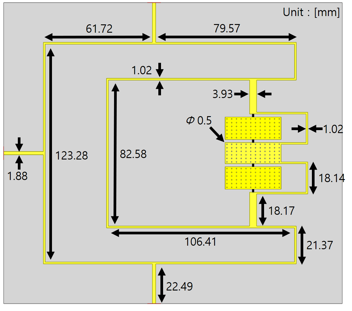 matching 기법을 기반으로 설계하였으며, 전체 회로의 전기적 길이를 최소화하고 최적화하기 위해 Open stub 대신 Short stub을 사용하였다.