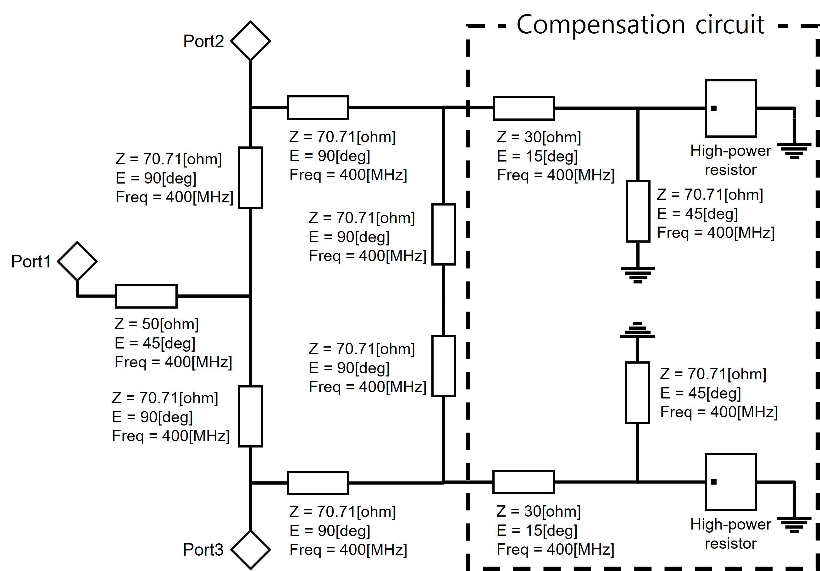 그림 7에 나타내었다. 해당 보상회로는 접지된 고전력 저항과 이를 보상하기 위한 Short stub 및 직렬 전송선로로 구성된다. 본 보상회로는 Single-stub
