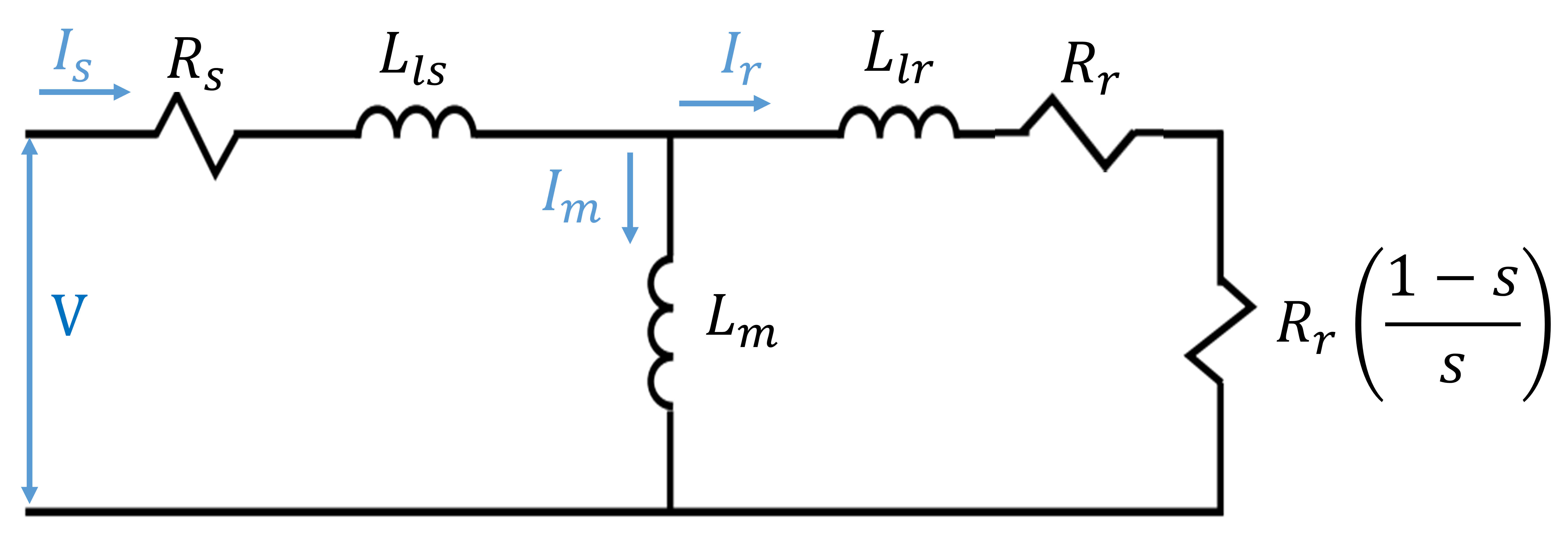 여기서, ${R}_{{s}},\: {R}_{{r}}$은 고정자와 회전자의 저항이고, ${L}_{{ls}},\: {L}_{{lr}}$은 고정자와 회전자의 누설인덕턴스이다. ${L}_{{m}}$은 자화 인덕턴스이고. ${s}$는 슬립이다.
