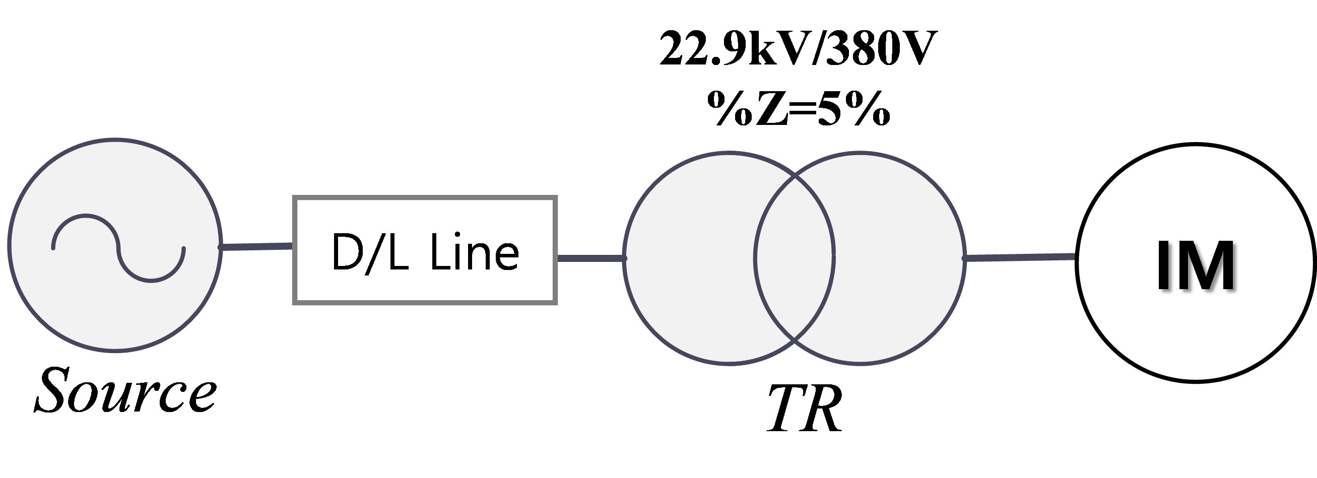 변압기를 안전하게 운용하기 위해서는 부하의 운전조건에 적합한 용량을 정확히 산정하는 것이 매우 중요하다. 일반적으로 변압기의 용량은 정격 운전 기준으로 결정되지만, 유도전동기와 같은 기동 부하는 기동 시 큰 전류가 흐르므로 전압강하를 고려한 별도의 용량 산정이 요구된다. 특히, 변압기가 이러한 기동전류를 충분히 감당하지 못하는 경우 과부하로 과열 및 수명 저하를 일으킬 수 있다[5-7]. 따라서 기동특성을 반영한 적절한 용량 확보가 필수적이며, 전압강하를 고려한 합리적인 용량 산정은 변압기 설계의 핵심 요소 중 하나로 작용한다. 그림 2는 변압기에 유도전동기가 연결된 단선 결선도이다.