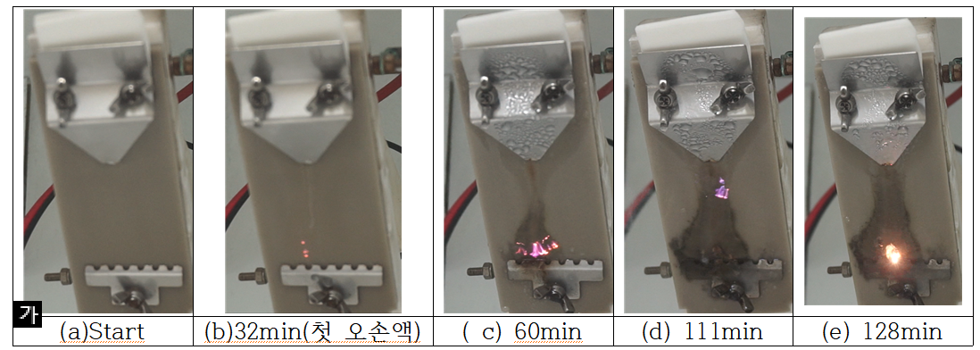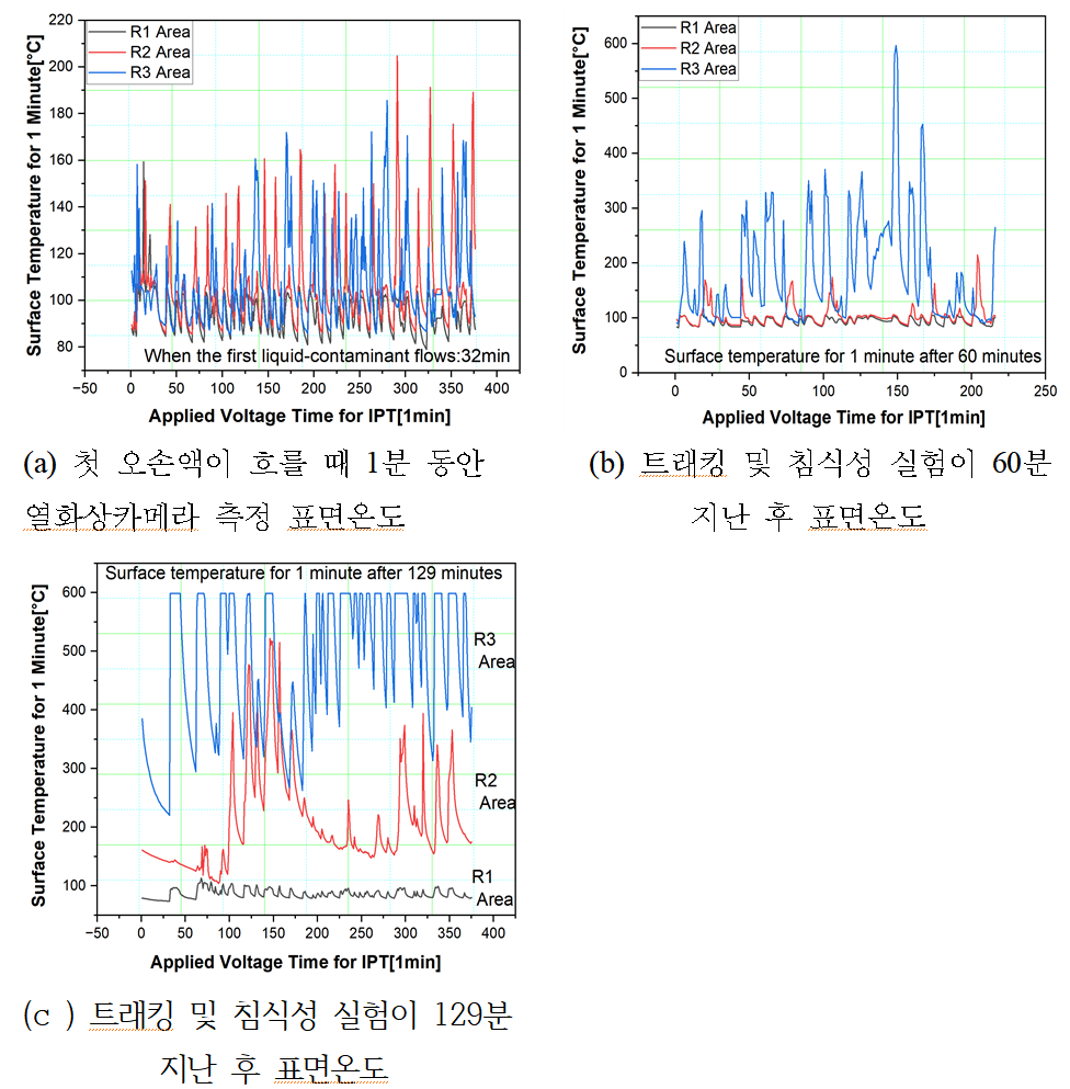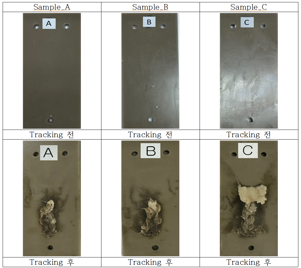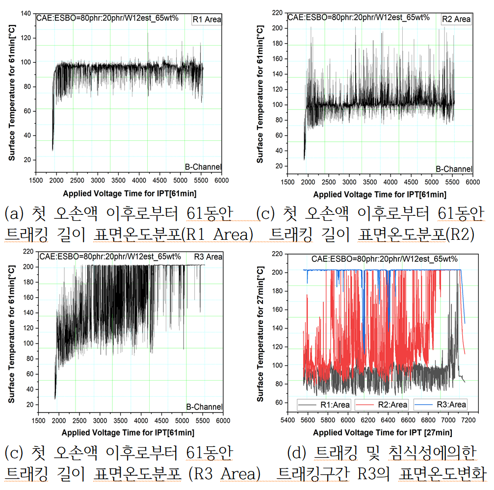 평가내용은 시간에따른 누설전류크기와 트래킹 길이 내에서 열화상 카메라를 이용한 실시간 표면온도 데이터를 얻었고 그리고 침식량을 계측하였으며, 트래킹
