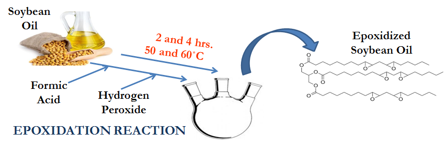 ESBO(Epoxidized Soybean Oil)는 대두유를 에폭시화하여 얻은 유기 화합물의 집합체이다. ESBO의 합성[23,24][20,21]은 대두유(195g)와 포름산(23g)을 그림 2에서 나타낸 합성과정으로 온도계와 자석 교반기가 장착된 3구 플라스크에 넣고, 다양한 과산화수소에 대한 포름산에 대한 탄소 이중 결합의 3가지 다른