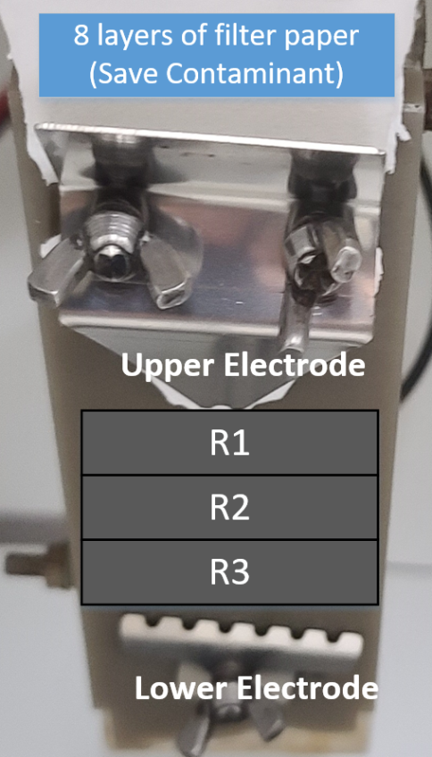 접지에 연결된다. HVDC 부극성 실험은 상부전극에 부극성 전위를 갖는 것으로 정의를 내리고 하부전극은 접지로 연결된다. 샘플은 측정 샘플표면이 아래쪽에
