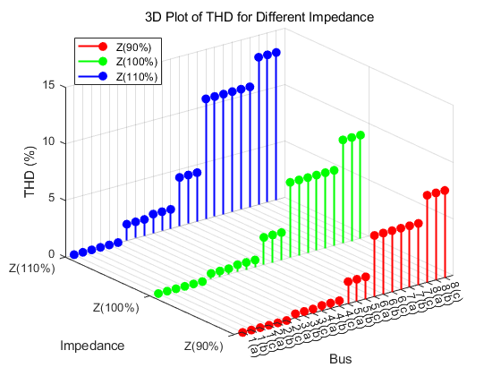 90%일 때 5번 모선의 전류 THD는 56.6682%이며, 임피던스가 110%일 때는 45.9736%로 나타났다. 이는 선로 임피던스가 증가할수록