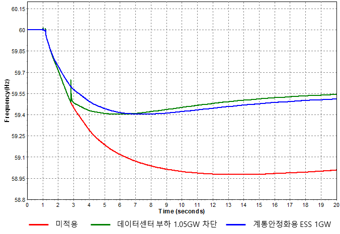 따라 3GW 발전기(신한울1, 2호기)가 탈락하는 상정고장을 적용한다. 또한, 데이터센터 부하 차단 효과를 비교하기 위해 기존 계통 안정화용 ESS