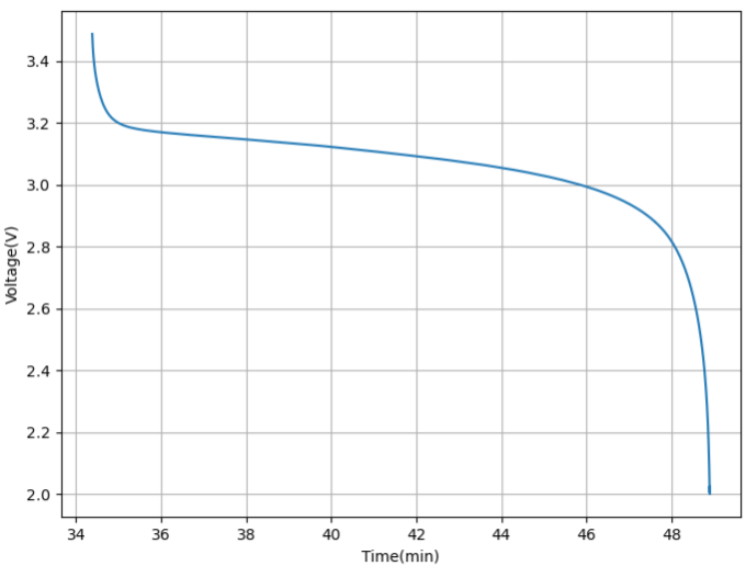 ๋ฃ ์์ ๊น์ง์ ์ ์ ๋ณํ๋ฅผ ์๊ณ์ด๋ก ๋ํ๋ด๋ฉฐ, ์ด๋ ๋ฐฐํฐ๋ฆฌ์ ๋ด๋ถ ์ํ ๋ฐ ์ดํ ์ ๋๋ฅผ ๋ฐ์ํ๋ ์ค์ํ