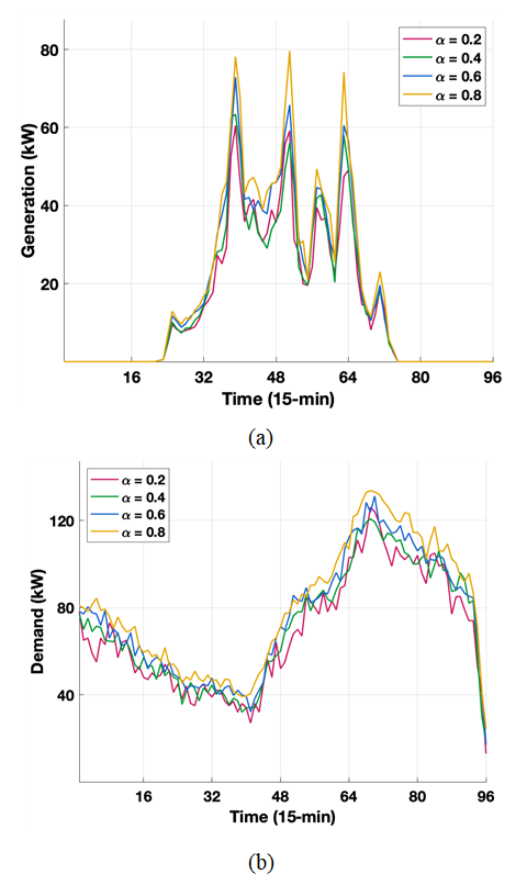 vehicle load in terms of $\alpha$: (a) Photovoltaic generation and (b) electric vehicle