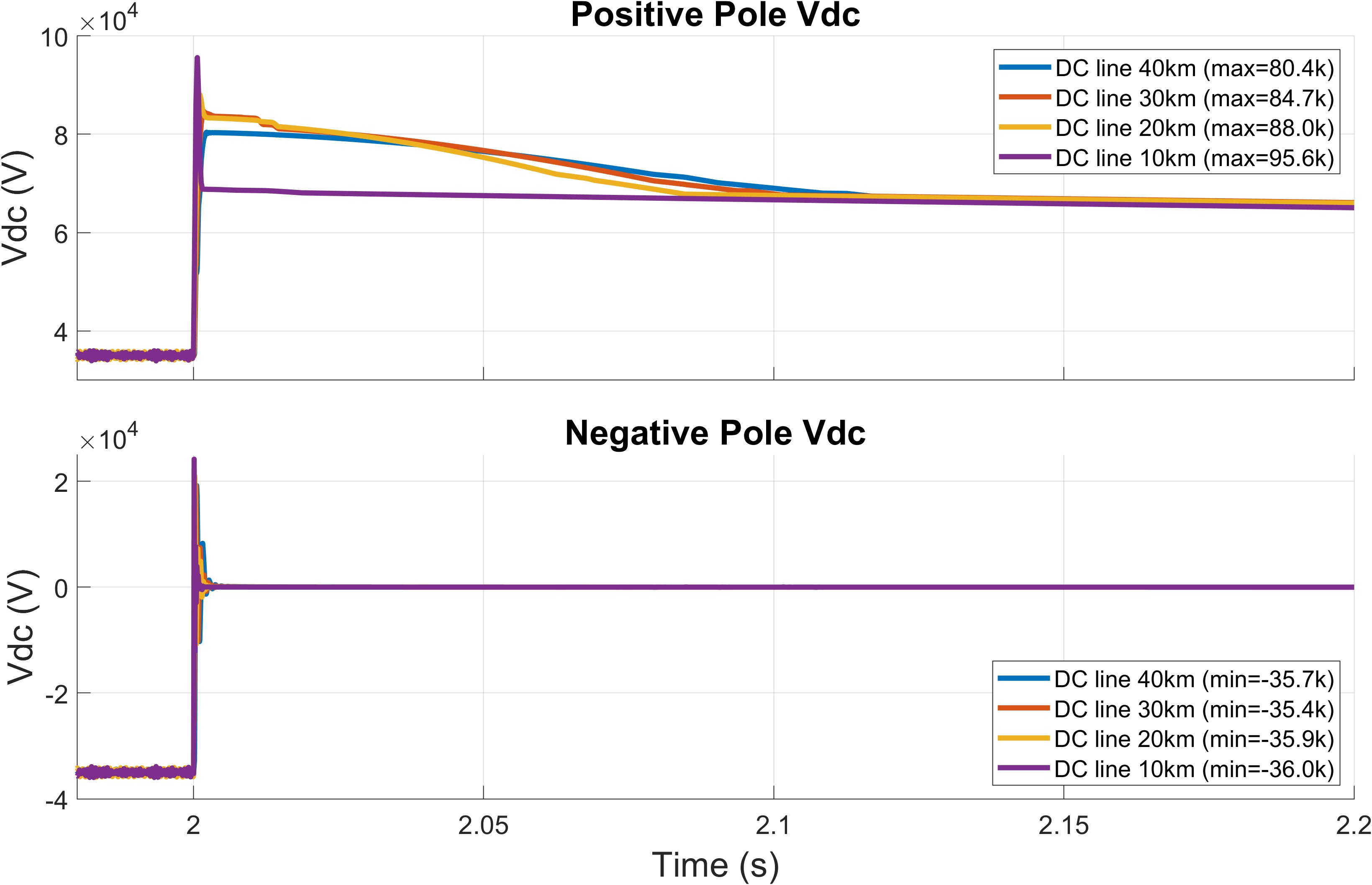 모의 결과, 선로의 길이가 짧을수록 DC 과전압이 크게 발생하며, 다만 그 과전압 해소 속도는 빠른 것을 확인할 수 있다. 이는 고장 발생 파형이