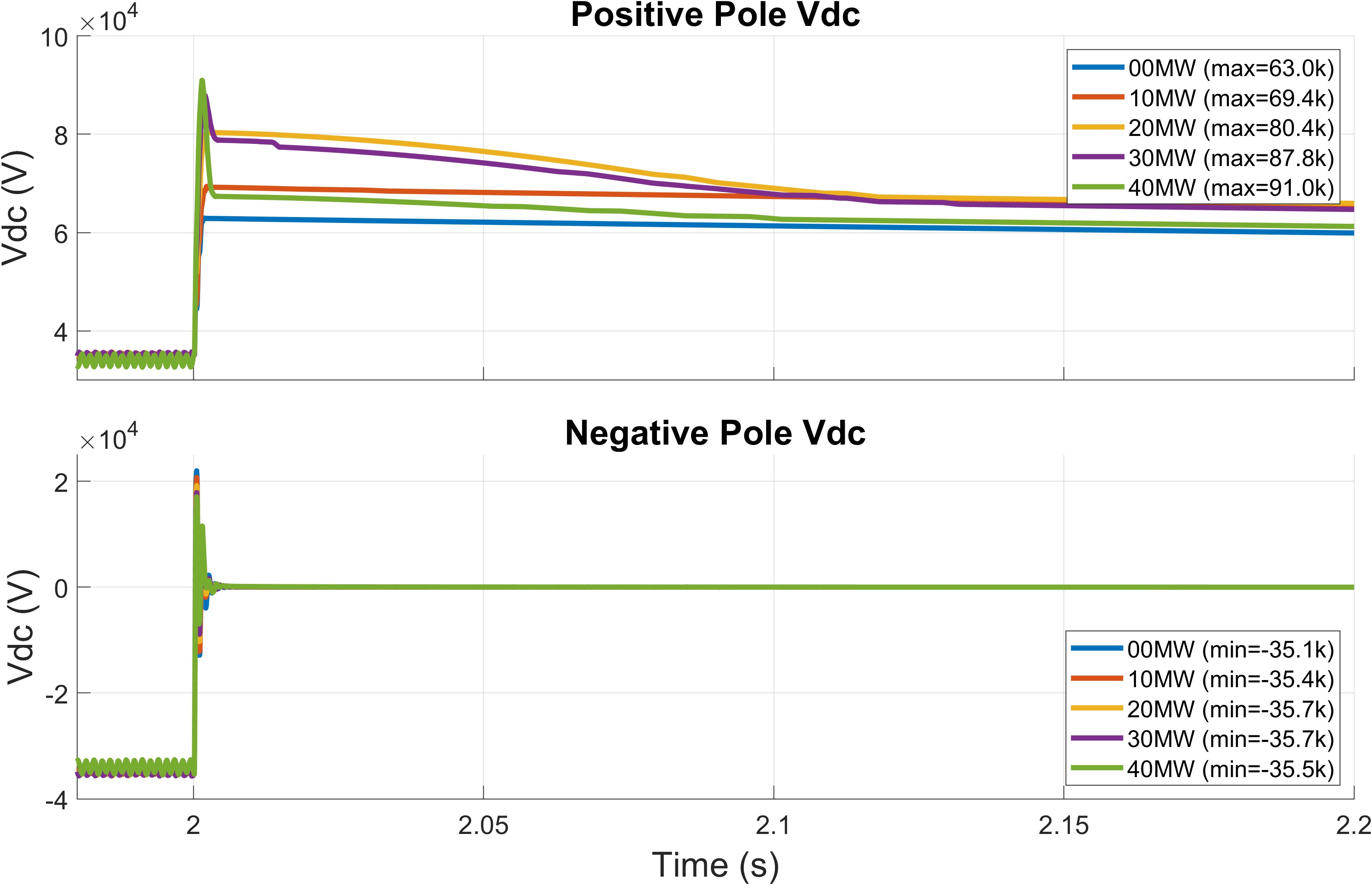 고장 전 송전 중인 유효전력에 따라 MMC-HVDC의 DC 과전압이 변화한다는 연구들도 제시되어 있다. 본 논문에서도 이를 확인하기 위해 MMC-MVDC에서