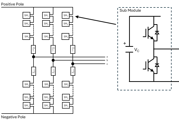 토폴로지 중 하나이다. MMC는 한 상을 상·하 Arm으로 구성하고 각 Arm에 직렬 연결된 다수의 서브모듈을 제어하여 커패시터 전압을 합성함으로써