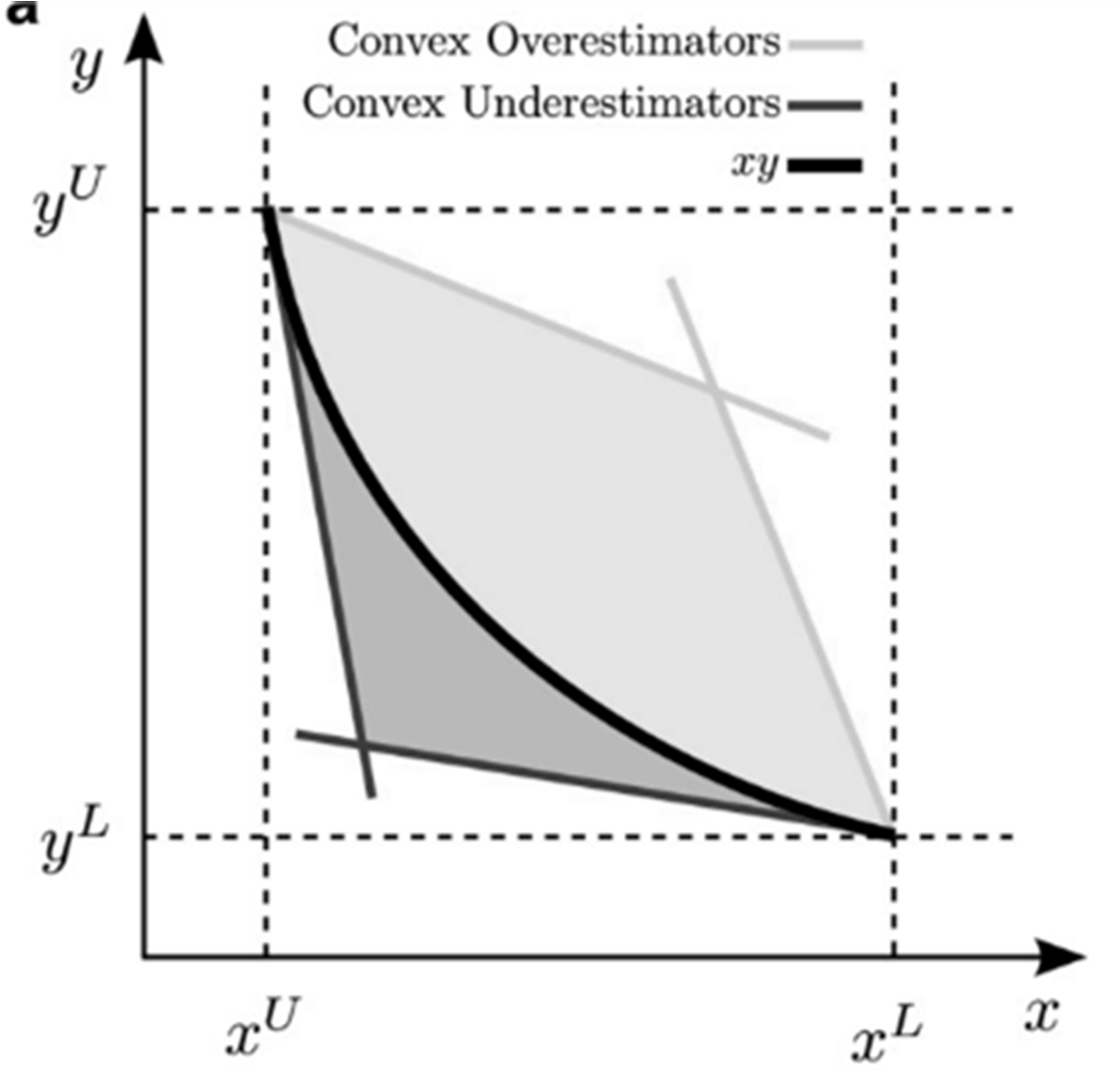재구성할 수 있다. McCormick Relaxation은 아래 그림 3과 같이 두 변수의 곱셈 형태의 비선형성(Bilinear)을 해결하기 위한 방법으로, 각 변수의 상한, 하한 값을 토대로 convex 화 시키는 방법이다.