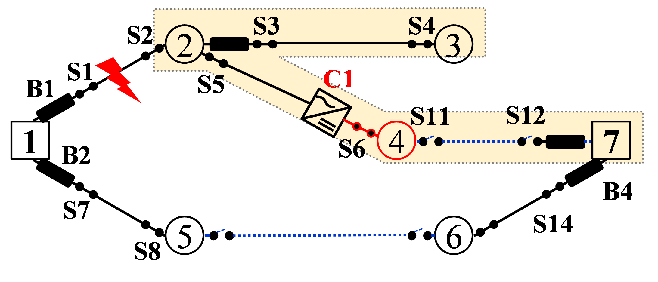 시, 차단기 B1이 동작하고 버스 (2~4)는 선로가 복구되는 시간 까지 고장을 경험한다. 하지만 용량이 충분할 경우, 연계 선로 (4,7)을 통해