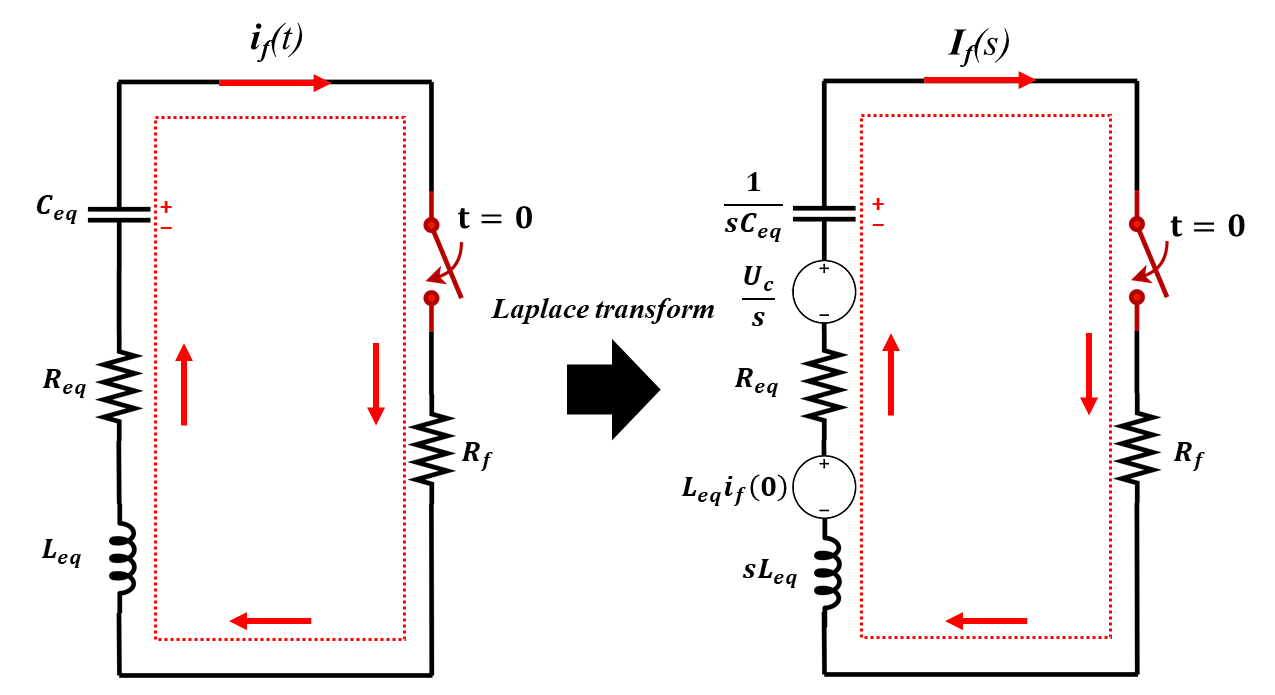 RLC 등가회로를 활용하여 고장 전류 회로를 도출할 수 있으며, 그림 3의 우측 회로는 이를 주파수 영역에서 해석한 결과를 나타낸다.