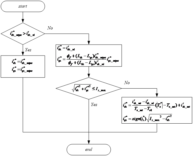 \le I_{s\_max}$이면, $i_{ds}^{r*} = i_{ds\_nl}^r$이고 $i_{qs}^{r*}$은 식(12)에서 계산된 값을 출력한다. 그러나 $\sqrt{i_{ds}^{r*2} + i_{qs}^{r*2}} > I_{s\_max}$인 경우, 즉 전류지령의