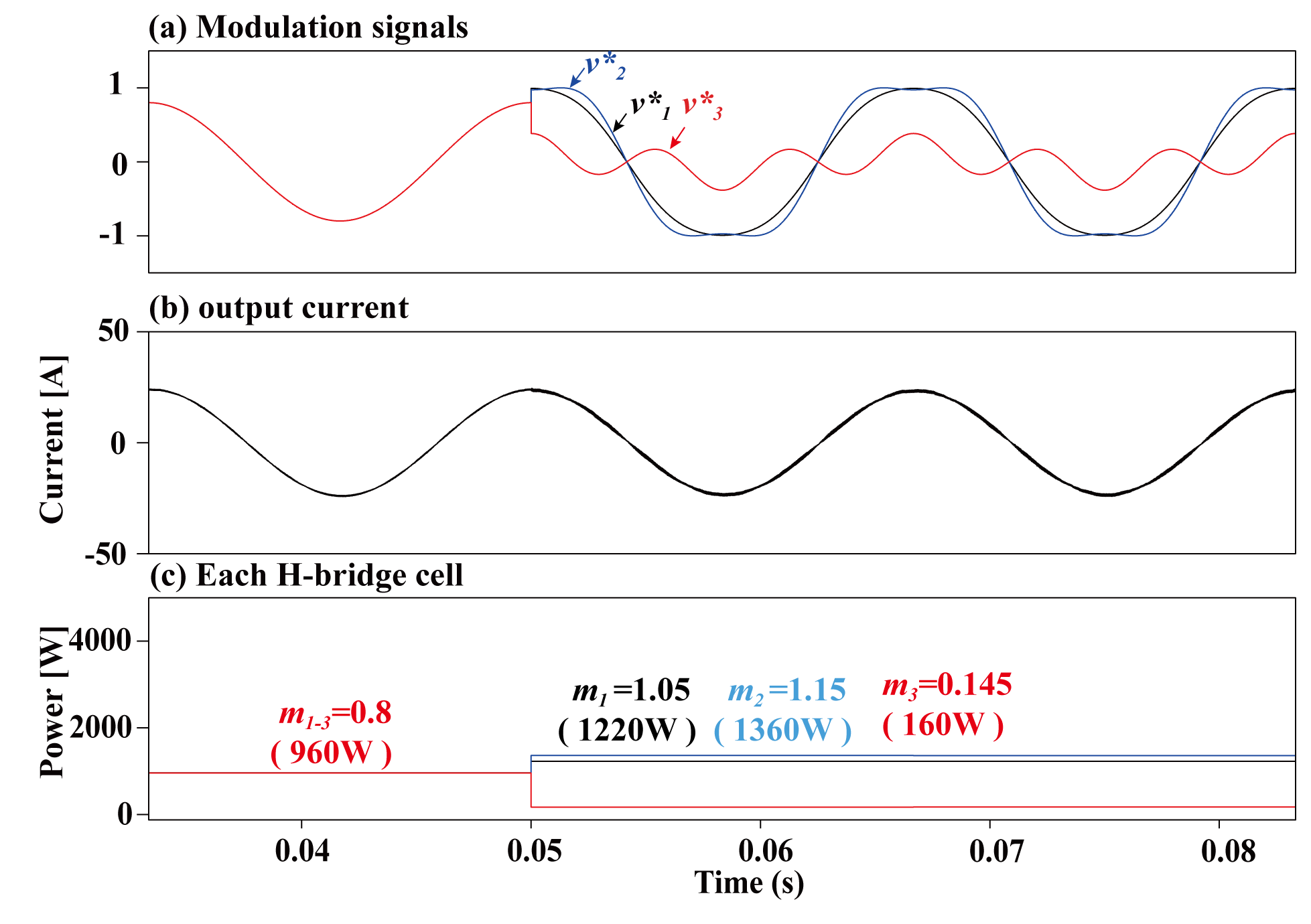 ๊ทธ๋ฆผ 16. ๋จ์ THIPWM ๊ธฐ๋ฒ์ ์ต๋ ๋ณ์กฐ ๋์ (๋ณ์กฐ์ง์๊ฐ 0.8์ธ ๊ฒฝ์ฐ): (a)์ง๋ น ์ ํธ, (b) ์ถ๋ ฅ์ ๋ฅ ๋ฐ (c) ๊ฐ ๋ชจ๋ ์ถ๋ ฅ ์ ๋ ฅ