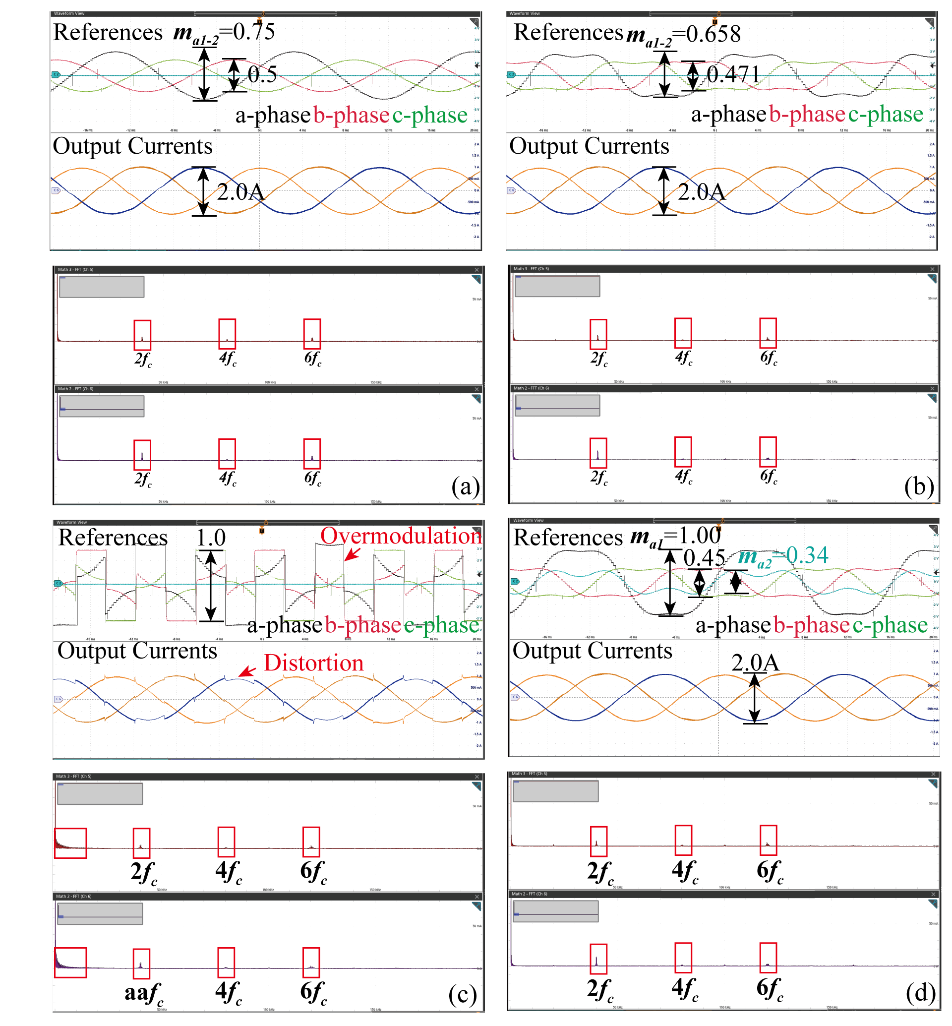 ๊ทธ๋ฆผ 24๋ SPWM ๊ธฐ๋ฒ์์ ๋ชจ๋ ๊ฐ ๊ท ํ ์กฐ๊ฑด๊ณผ ๋ถ๊ท ํ ์กฐ๊ฑด์ ์ง๋ น ์ ํธ์ ์ถ๋ ฅ ์ ๋ฅ ๋ฐ ์ฃผํ์ ์คํํธ๋ผ์ ๋ณด์ฌ์ค๋ค. ๊ทธ๋ฆผ 24 (a) 0.8๋ก ๊ท ํ์ ์ผ๋ก ๋ณ์กฐ๋ ๋ ์ฝ 1.7A๋ก ๋ํ๋๋ฉฐ ์ด๋ ์ฃผํ์ ์คํํธ๋ผ์์ ์ค์์นญ ์ฃผํ์์ 6์ฐจ ์ฑ๋ถ๋ถํฐ ๋ํ๋๋ค. ๋ฐ๋ฉด ๊ทธ๋ฆผ 24 (b)์์ ๋ชจ๋ 1์ 1.0์ผ๋ก ๋ณ์กฐ, ๋ชจ๋ 2๋ 0.8 ๋ฐ ๋ชจ๋ 3์ 0.6๋ก ๋ณ์กฐ๋ ๋ 2์ฐจ์ 4์ฐจ ์ฑ๋ถ์ด ์์ฑ๋๋ค. THD๊ฐ์ ๊ท ํ ์กฐ๊ฑด์์ 2.04%,